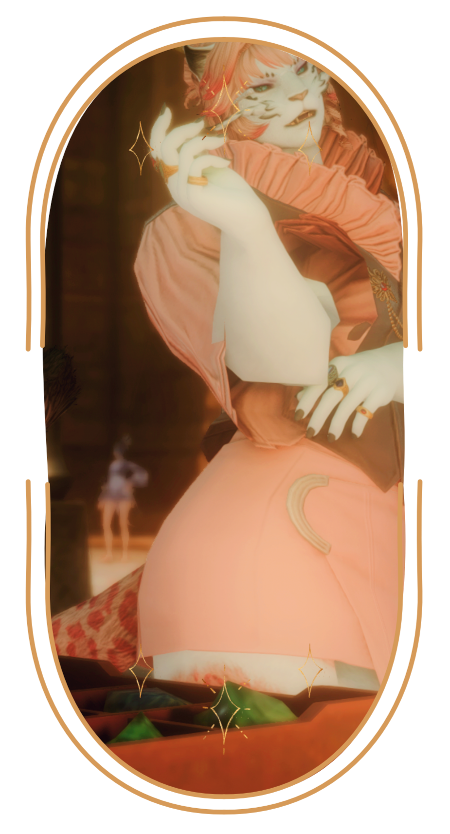 Presently Tasya splits her time between keeping her house in order, rubbing elbows with Ul'dah's elite, and leading operations of the Dove's Nest and its subsidiaries hoping to expand her influence to all corners of the world.In her spare time when she's not strolling the gardens and cafes of the City states, Tasya can be found hosting lavish events with her long time friend, one of her newly obtained pet projects.But sure that cannot be the full story